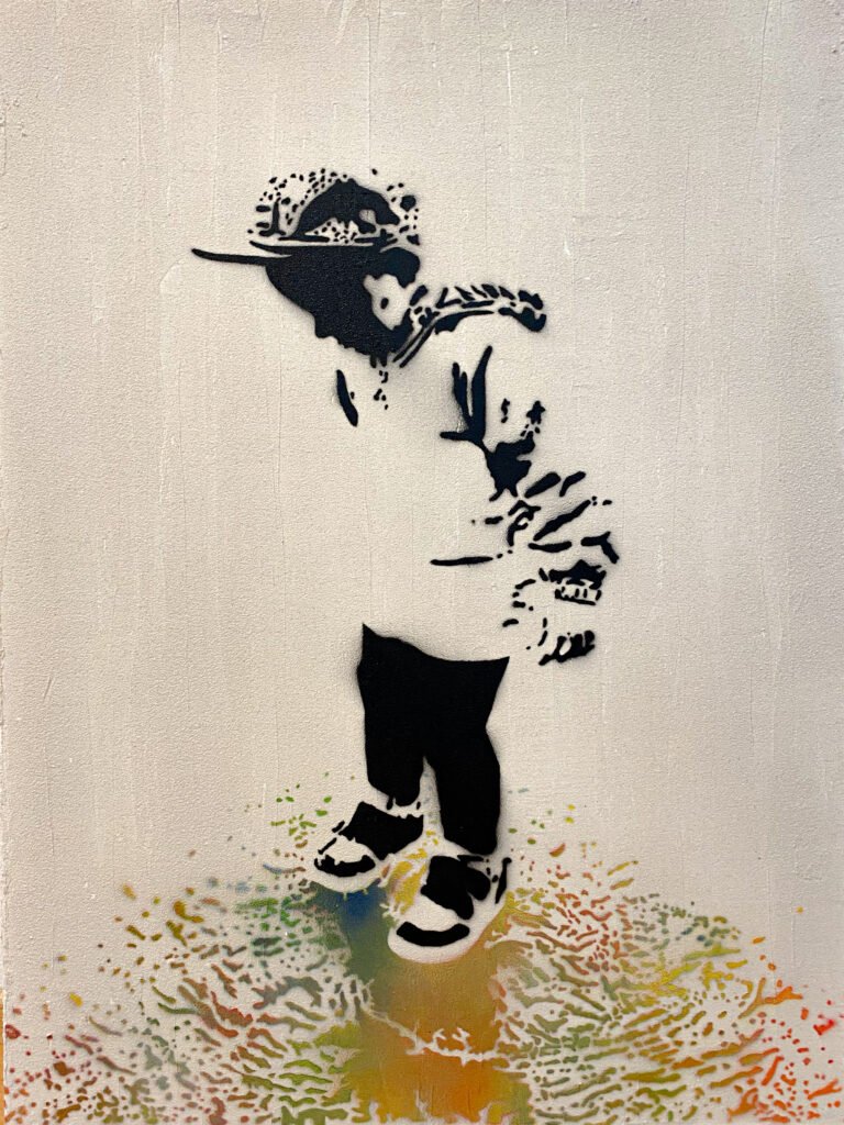 „the san andreas kid“ ist inspiriert von einem meiner fotos aus dem jahr 2015, aufgenommen in los angeles. der titel spielt auf die tektonische verwerfung an der us-westküste an. ein kind versucht einen riss im boden zu verdecken – doch farbe lässt sich nicht aufhalten.