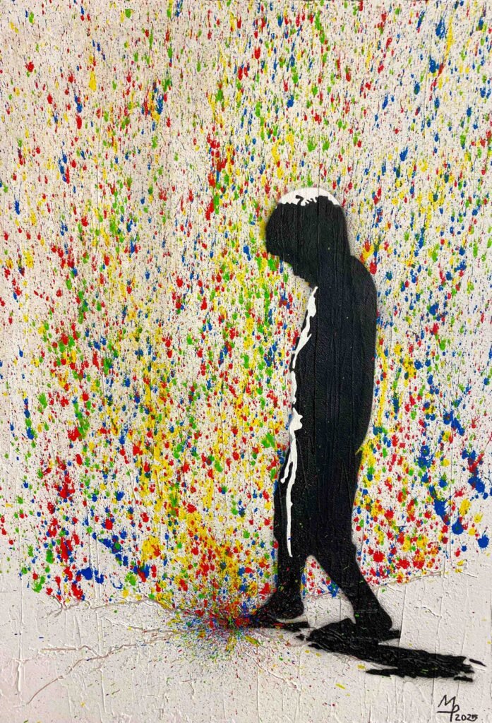 „j’s wasserparade“ zeigt ein kind beim hüpfen in einer pfütze. ein persönliches werk, zu dem ich in hamburg inspiriert wurde. kindliche leichtigkeit lässt selbst jeden grauen nieselregen farbig wirken.